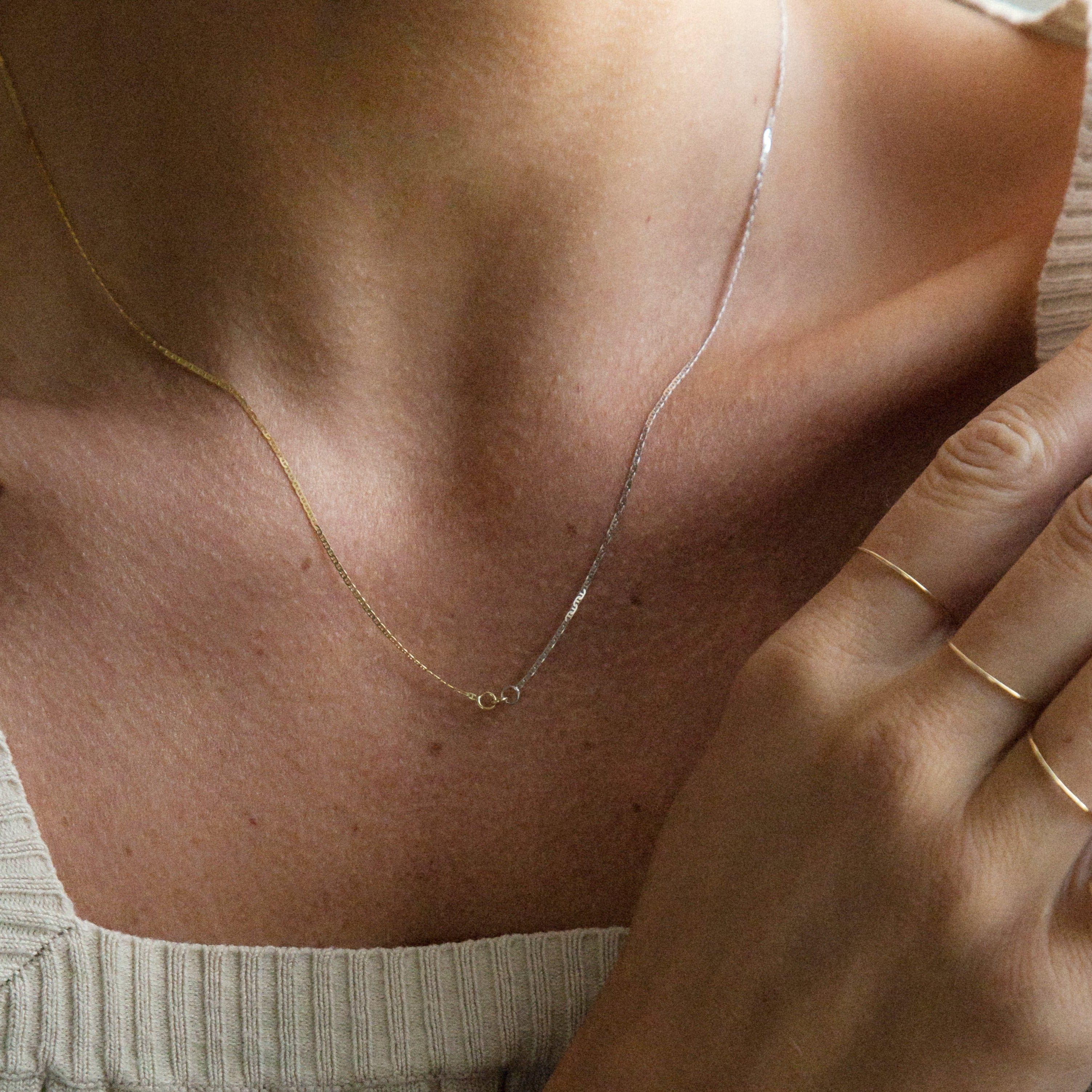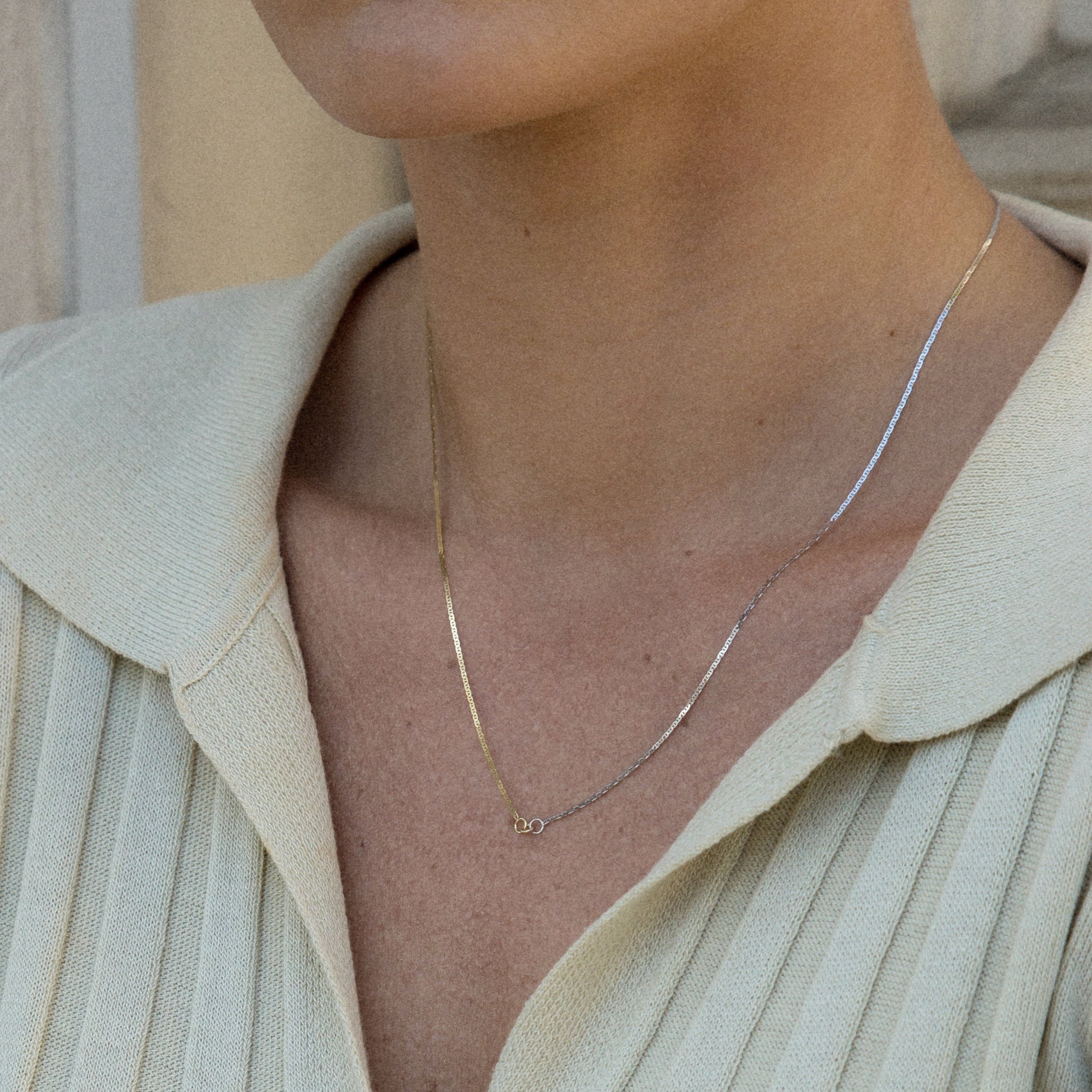 A playful take on our best-selling core chain, the Marina Unity Chain is all about finding beauty in the unexpected. Utilizing the same delicate mariner chain in two different materials, the outcome is both striking and complementary.