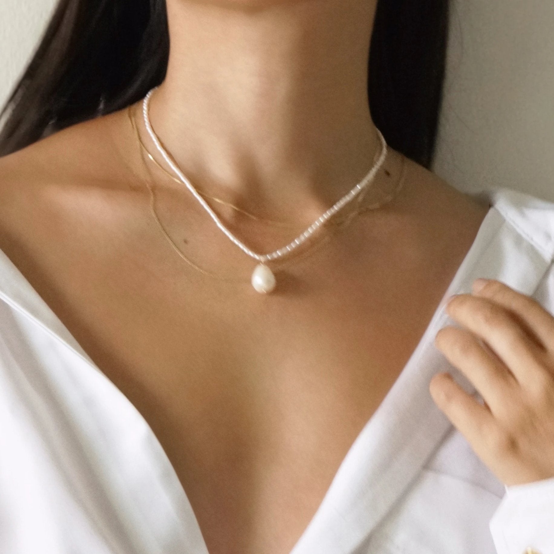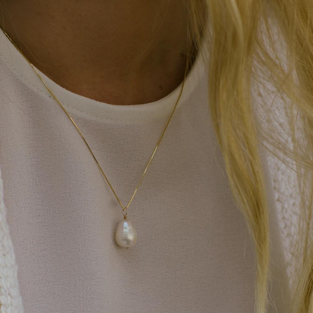 The organic shape of the pearl brings a modern feel to any chain or hoop.